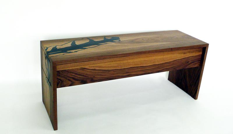 Bank mit geschnitzter und gegossener schwarzer Feder und einer durchgehenden Schublade