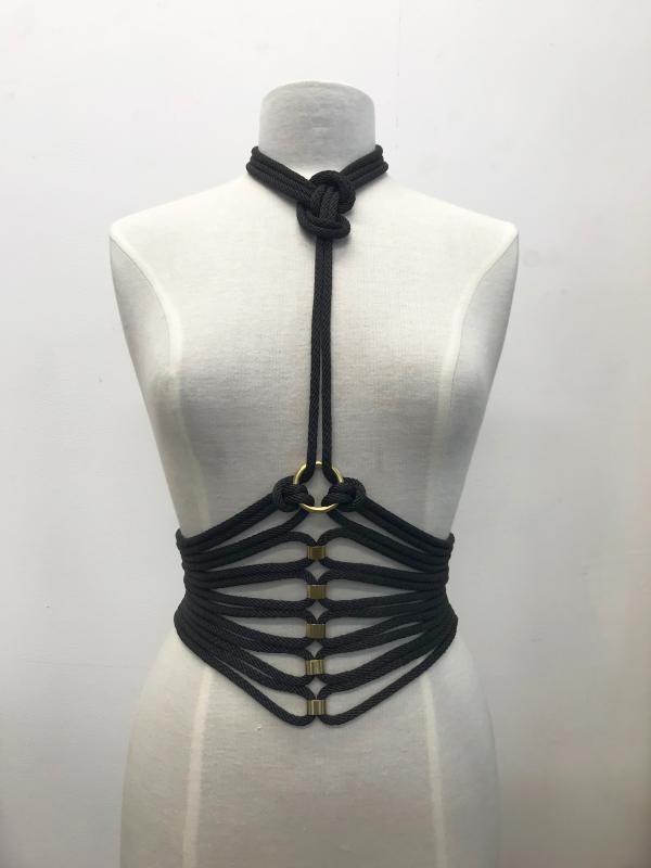 Dieser wunderschöne Korsettgürtel ist aus Polyesterseil angefertigt. Auf der Seite sind die Seile zusammengenäht. Hinten werden die Seilenden eingefädelt und geschnürt wie bei einem klassischen Korsett. Die vorderen Seilenden kommen oben um den Hals. Hier sind verschiedene Abschlüsse möglich. Das mitgelieferte Tutorial zeigt ein paar Beispiele.