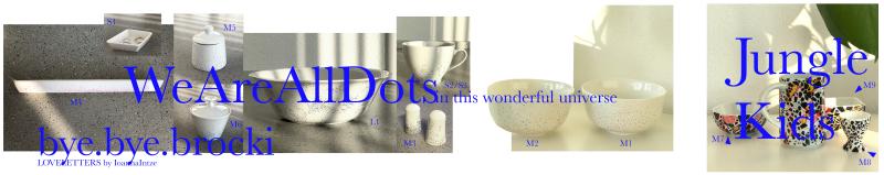 Krüge können Vasen sein, Zuckerdosen Schmuckdosen, alles kann nichts muss. Und sie erzählen uns Geschichten. "We Are All Dots"... in this wonderful universe: verdichtende und auflösende Punkte, erinnern daran, dass wir alle universell miteinander verbunden sind und erzählen von Geborgenheit & Freiheit. "Jungle Kits": Animal Terrazzo Spuren überlagern teils Kindermalspuren und erzählen vom Zusammenkommen