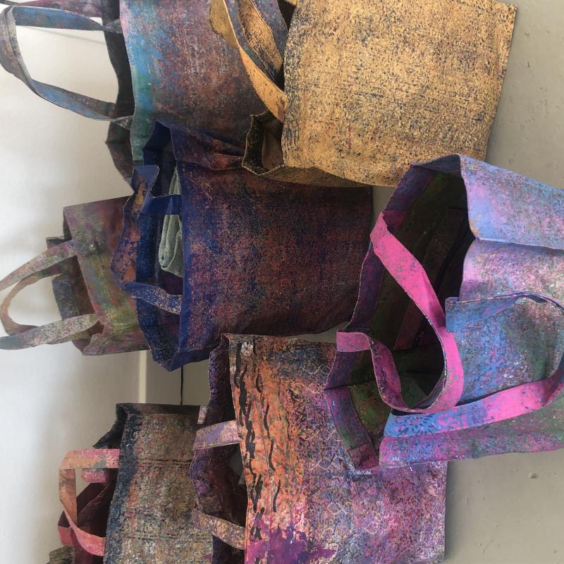 Jede Tasche / Etui ist ein Einzelstück, da aus einem 'Abfallprodukt' der Blockprint Produktion hergestellt. Die Überlagerung von den verschiedenen Farben und Muster bilden eine Tasche. Sie werden für Banglar Pannya von Paraa, einem Architektur/Kunst/Mode-Kollektiv in Dhaka hergestellt .