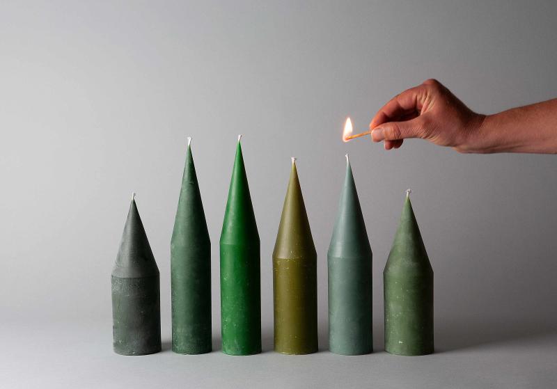 Die Spitz Kerzen aus recyceltem Wachs werden in Zürich in einer sozialen Institution von Hand gefertigt. Sie bestehen aus Wachsresten von Kunden oder aus fehlerhaften Stücken aus der Produktion. Da das recycelte Wachs immer verschiedenfarbig ist, hat kaum eine Kerze den gleichen Farbton wie die andere. Wir haben so je eine grüne und eine rote Farbwelt aus unterschiedlichsten Farbtönen kreiert. Die Farben, die uns aus der Kerzenmanufaktur geliefert werden, sind immer wieder unterschiedlich.