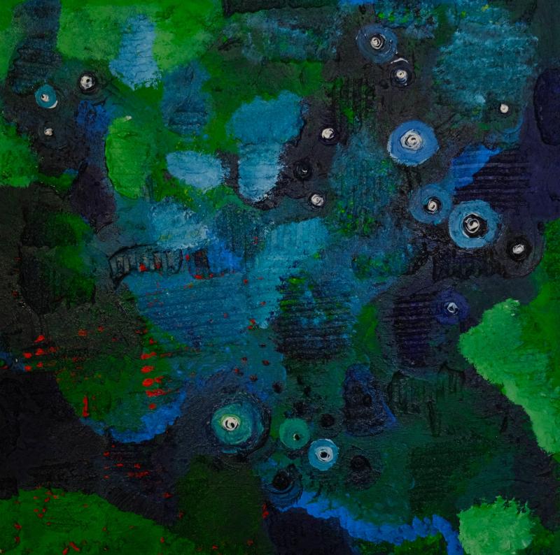 Yvonne Roos malt mit Acryl, Gouache und Ölfarbe, dazu Gipsbinden, Strukturpaste und Fenstermalfarbe. Ihre Bilder laden ein, aus dem grauen Alltag zu entfliehen und in eine bunte, spontane und kreative Welt einzutauchen.