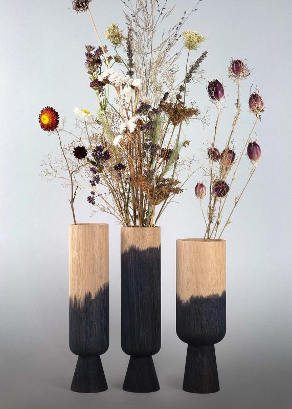 Blue ist ein Gefäss für Trockenblumen; eine Vase aus Holz. Sie ist sozusagen aus demselben gewachsenen und getrockneten Pflanzenmaterial gemacht, wie die Trockenblumen es selbst sind und sie ist von unserem Drechsler in Deutschland in Handarbeit hergestellt. Die blaue Verfärbung entsteht durch eine chemische Reaktion von Metallsalzen mit der im Holz enthaltenen Gerbsäure; eine Eigenschaft, die man sich unteranderem auch beim pflanzlichen Färben von Textilien zunutze macht. Vor mehr als zweitausend Jahren wurde auf dieselbe Weise mit gerbstoffreichen Galläpfeln und Eisensulfat eine sehr beständige Tinte hergestellt. Die Verfärbung auf der Vase ist je nach Holzart verschieden und erzählt uns etwas über die Inhaltsstoffe des Holzes.