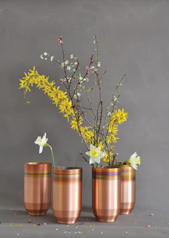 Die Blumenvase Alba wird geformt von Flammen und purer Muskelkraft. In der Metalldrückerei arbeiten Handwerker nach einem traditionellen Verfahren. Sie drücken Kupfer auf eine bestehende Form und erhitzen es dabei von Zeit zu Zeit mit einer Flamme, damit es geschmeidig bleibt. Durch die unterschiedlich hohen Temperaturen auf der Metalloberfläche entstehen wie durch Zauberhand faszinierende Anlassfarben von Orange über Grün bis Violett.