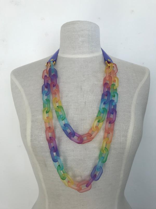 Diese Regenbogenfarbige Halskette besteht aus leichten Plastik Gliedern und einer Halsschlaufe aus schillernder PVC Folie. Ein tolles "must have" Piece für den anstehenden Festival Sommer oder die Pride! ;)